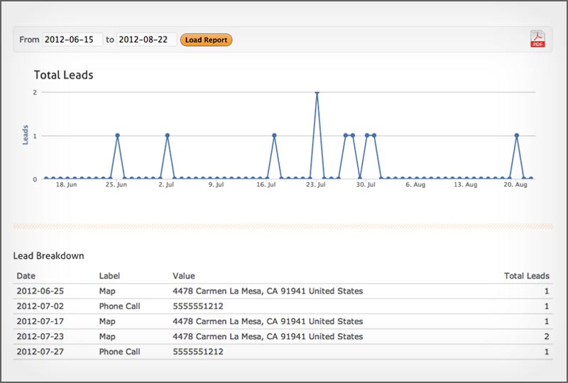 Lead Generation tracks visitor engagement on links and buttons generating phone calls, text messages, emails, GPS map directions, PayPal donations, and purchases.