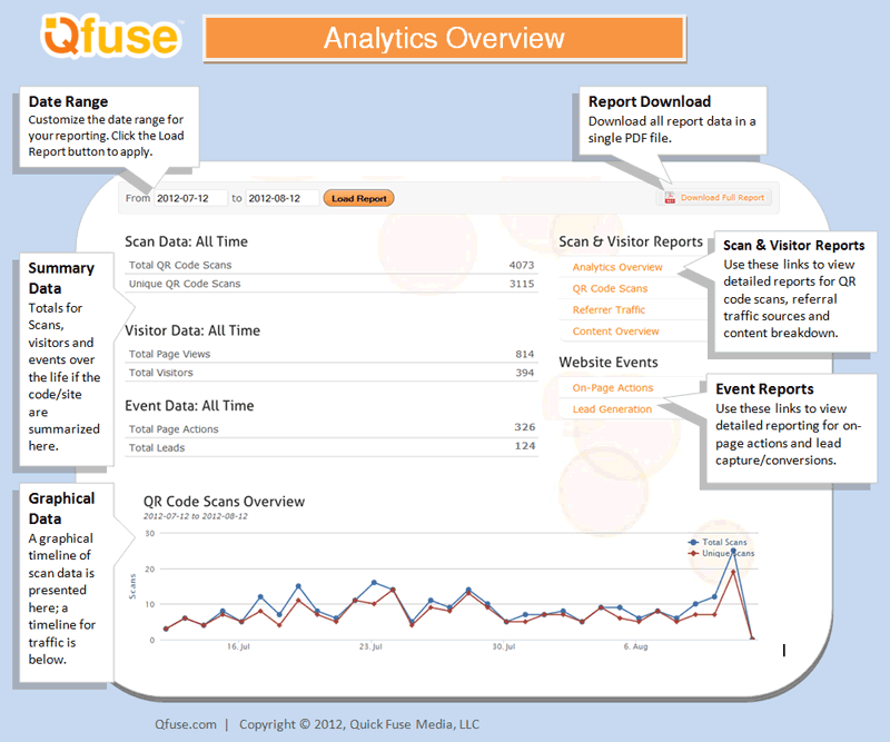 The analytics feature tracks QR Code scan data, mobile site usage, and visitor engagement among other powerful statistics.