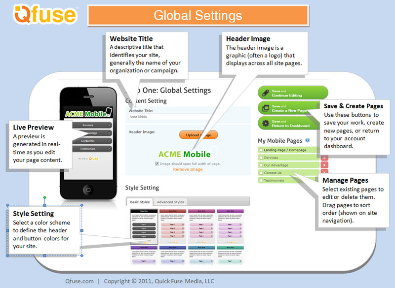 The Global Settings page allows you to define the elements that carry across all site pages, including color scheme, site title, and header graphic.